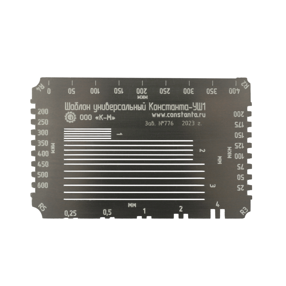 • конструктивное исполнение в виде шаблона, изготовленного из пластины нержавеющей стали, с радиусами закругления краев 2, 3, 4, 5 мм и прорезями с шагом 1, 2 и 3 мм