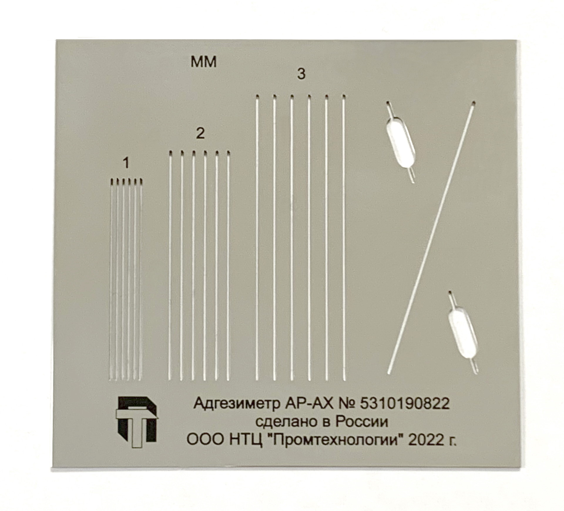 Конструктивно адгезиметр надрезов выполнен в виде шаблона, изготовленного из плоской нержавеющей стальной пластины, на которой сделаны нормированные прорези. На приборе есть: