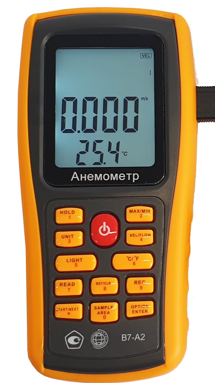 Модификация В7-А2 (термоанемометр, выносной зонд-крыльчатка) представляет собой мобильный многофункциональный микропроцессорный анемометр ручного формата. Он состоит из электронного блока с измерительным зондом выносного типа. Применяется для однократного и периодического измерения температуры и скорости направленного воздушного потока и других газов в вентиляционных каналах и системах кондиционирования с вычислением объёма расхода, средних, максимальных и минимальных параметров воздушного потока.