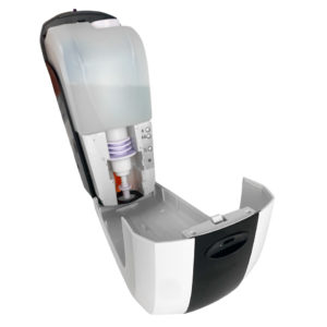 Оснащен встроенной ёмкостью на 1 литр с возможностью дозаправки, что позволяет избежать использования дорогостоящих расходных материалов в фасовке по 1 литру (как у локтевых дозаторов) и допускает дозаправку из более экономичных канистр на 5 литров.