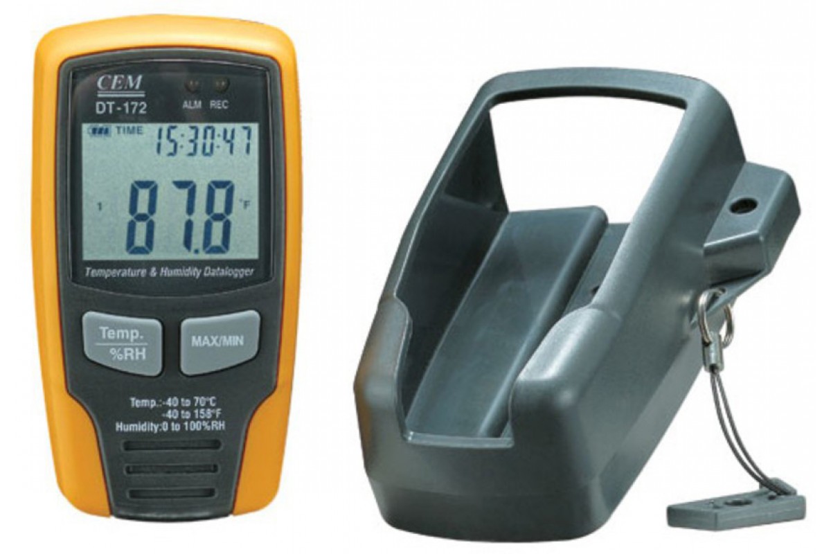 В комплекте с логгером CEM DT-172 поставляется настенное крепление в виде жесткого получехла, а также кодовый замок, предназначенный для предотвращения хищения прибора, что позволяет размещать измеритель в общественных местах, например, магазинах. Также к прибору прилагается программное обеспечение для обработки и передачи данных на ПК.