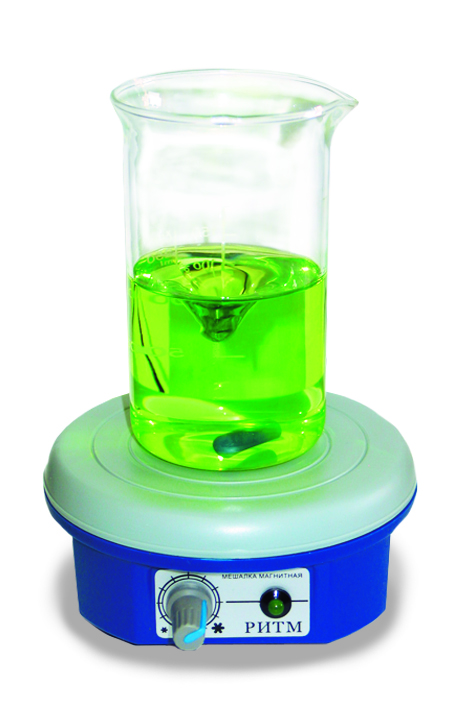 Магнитная мешалка «РИТМ-01» предназначена для перемешивания жидкостей с небольшими показателями вязкости с помощью вращающегося в магнитном поле якоря. Мешалка может быть использована при подготовке проб к проведению анализов. Мешалка представляет собой регулируемое технические устройство, которое обеспечивает выполнение операций по смешиванию реагентов при заданной постоянной скорости вращения магнитного якоря, помещенного в химический сосуд с жидкостью. Рабочая поверхность мешалки выполнена из полипропилена. Мешалка комплектуется якорем в виде цилиндрической ферритовой палочки мм в полиэтиленовой или фторопластовой оболочке.