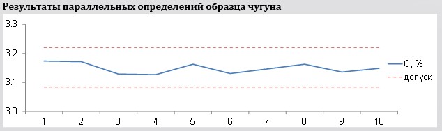 Ниже приведены примеры параллельных измерений образцов нержавеющей стали и чугуна. В качестве допуска указаны значения в соответствие с нормативами контроля внутрилабораторной воспроизводимости ГОСТ Р 54153-2010.