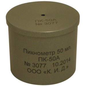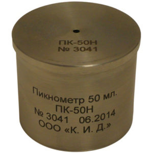 Пикнометр представляет собой стакан с притертой крышкой с отверстием в центре для выпуска излишков испытуемого материала. Пикнометр изготовлен из нержавеющей стали.