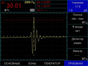 • радиоимпульс, амплитудой 50, 100, 150 или 200 В, с регулируемым числом периодов (0,5-10), и  изменяемой частотой радиоимпульса