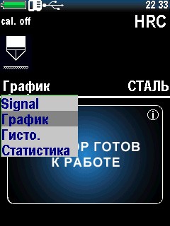 Отображение выбранной шкалы твердости, текущего материала, состояния батарейки, времени.