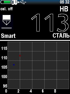 — большой цветной графический дисплей. Помимо имеющихся 88 комбинаций шкал твердости и материалов (калибровок), прибор дает возможность дополнительно настроить пользовательские шкалы и материалы. Информацию можно отобразить в виде гистограмм, графиков, таблиц, есть интеллектуальный режим, отображение отклонения, среднего, большое количество другой статистической информации; — прибор позволяет хранить и просматривать архив измерений, сохранять на карту памяти калибровки;